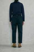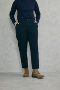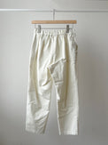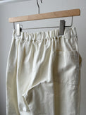 ポケット口のフラップは少し大きめに立体的に仕上げており、太もも周りをすっきり見せる効果があります。細身のテーパードシルエットで、通常のパンツとしてはもちろん、ワンピースの下にレイヤードしてインナー使いとしても活躍。生地はふんわりと起毛し、桃のようになめらかな肌触りが特徴です。心地よい着用感で、秋冬のコーディネートに取り入れやすい一枚です。