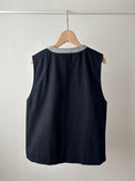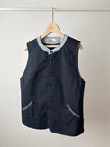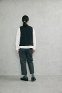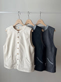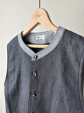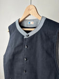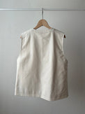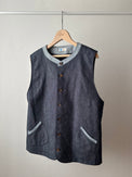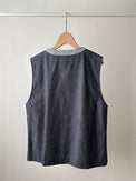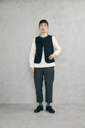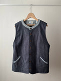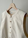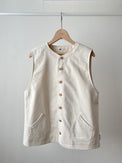 メンズのユーロヴィンテージに見られるハンティングベストをイメージし、綿ウールデニムで仕立てたベストです。生成り以外のカラーは、部分的に配色や裏使いのディテールを取り入れています。内側はコットンスレーキの総裏仕立てで、着心地にもこだわりました。生地はウール混のため、綿100%のデニムに比べてふくらみがあり、空気の層が生まれることで保温性も備えています。また、表面の毛羽立ちが冬らしいデニムの表情を楽しめる仕上がりです。