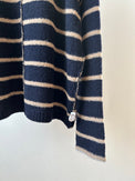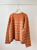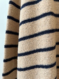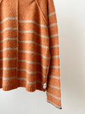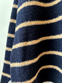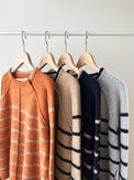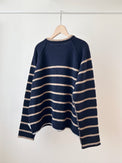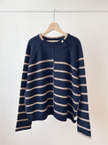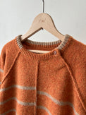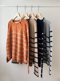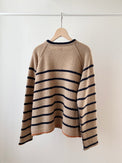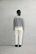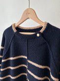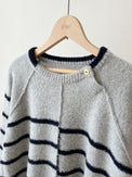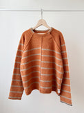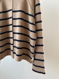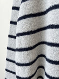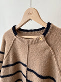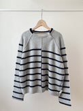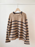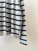 表情のある編み地に仕上げるため、あえて裏目を使い、柄の凹凸を引き立てたデザインにしました。素材の質感が引き立つような自然な立体感があり、カジュアルな中にもどこか上品な印象があります。さらに、左右の身頃でボーダーの段差を少しずらすことで、シンプルな中にもさりげない遊び心を加えました。
