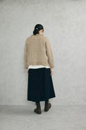 さらに柄編みで凹凸感を出し、表情豊かなデザインに。シャツやワンピースの上から羽織りやすいゆとりある身幅と、バランスの良い着丈がポイントです。
