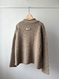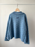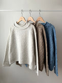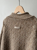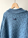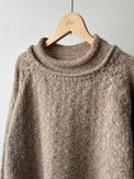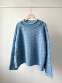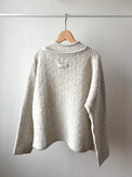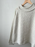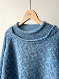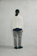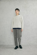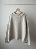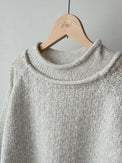 19.5μのウールを使用したスポンジッシュな紡毛糸とウールブークレーの糸を組み合わせ、ソフトで膨らみがあり軽量感のあるプルオーバーです。衿の切り替えにより2枚重ね風のレイヤードデザインが特徴。ラグランスリーブでリラックス感があり、1枚で着やすいアイテムに仕上げました。