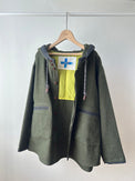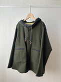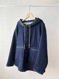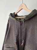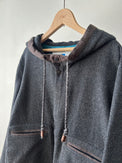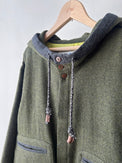 配色の組み合わせを工夫し、落ち着いた中にも表情のあるデザインに仕上げました。フードの紐には、ミックスカラーのロープを使い、アクセントとしてさりげない遊び心を添えています。