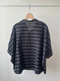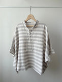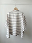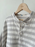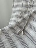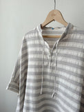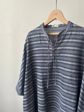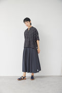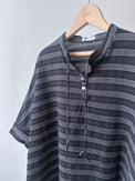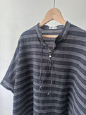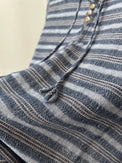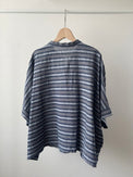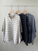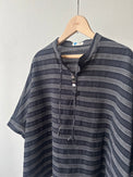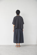 生地を横地使いにしたボーダー柄シャツです。スキッパー衿に、共生地の紐やループ釦を配し、細かな手仕事の温もりを感じられるアイテムです。 生地は、コットンカラミをベースにストライプに仕上げた生地です。織り柄と、配色で組み合わせた、バランスの良いストライプピッチです。シャリ感があり、ドライタッチな風合いが特徴です。