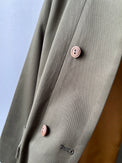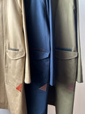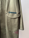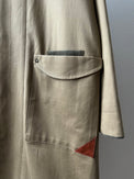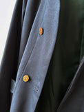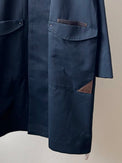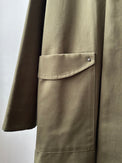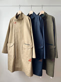 表地のピーチツイルをベースに、レザーやコーデュロイを部分使いすることで、季節感を出しました。更に大き目のポケットとポケット口にハトメ(ロバスト)を施し、メンズライクな印象にしました。衿裏や外付けの内ポケットには、色味を変えたコーデュロイ素材を使用。目立ちすぎない絶妙な配色で、着るたびに遊び心を感じていただけます。