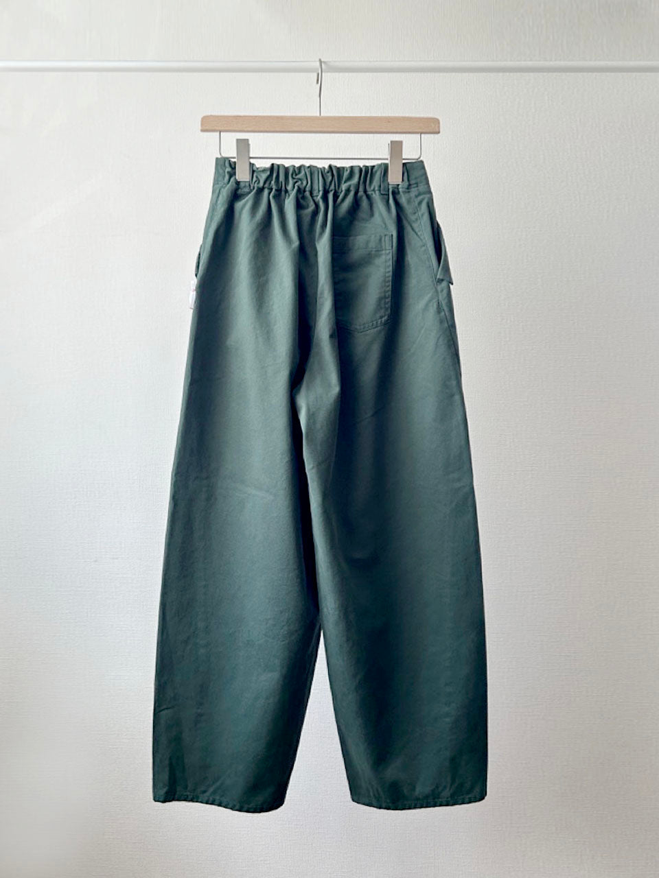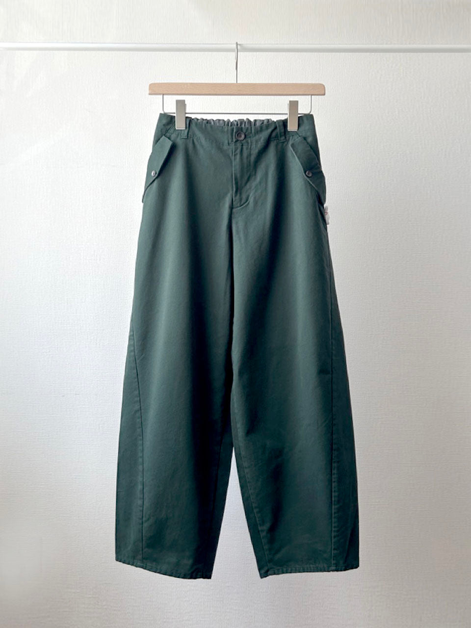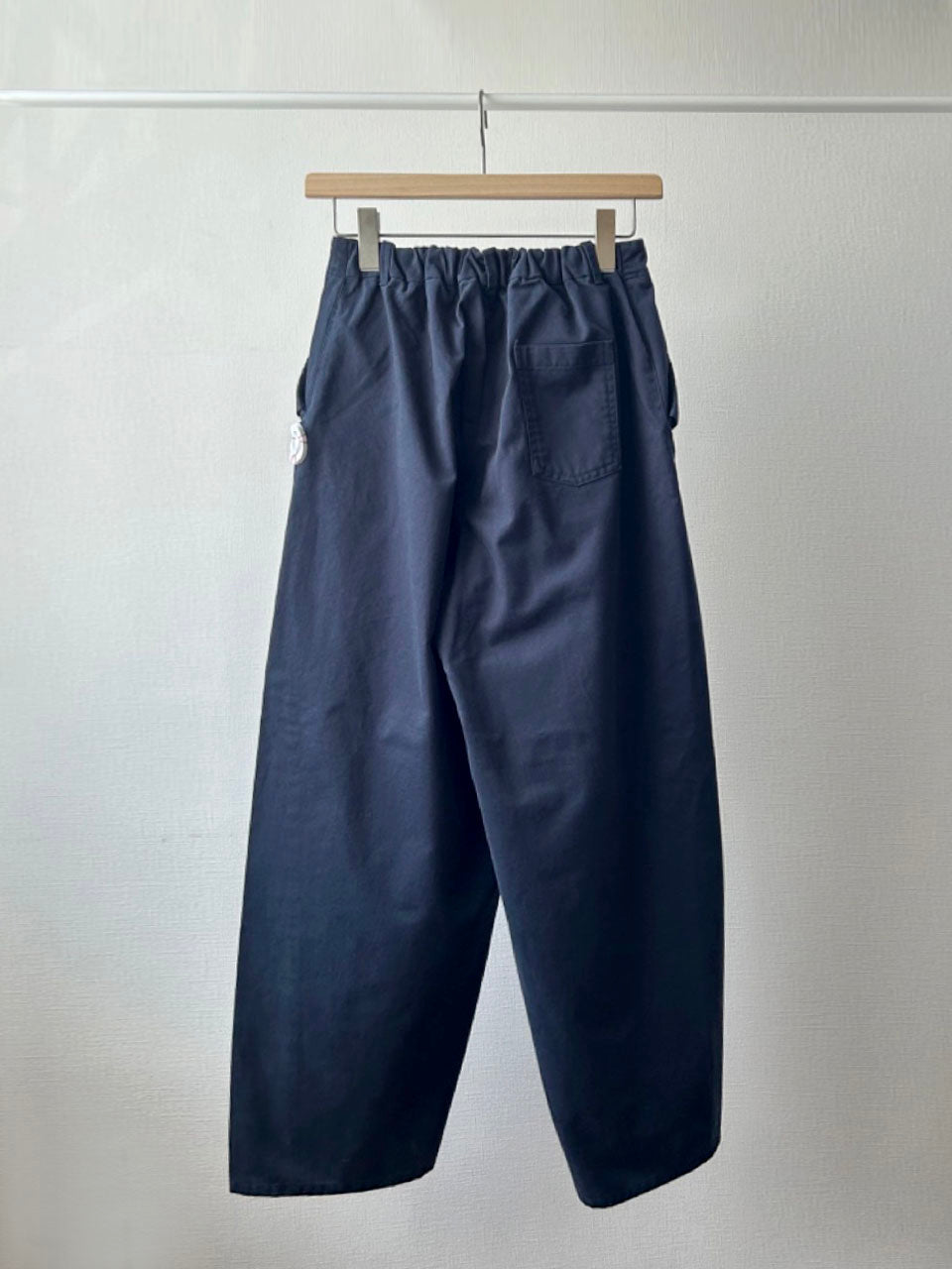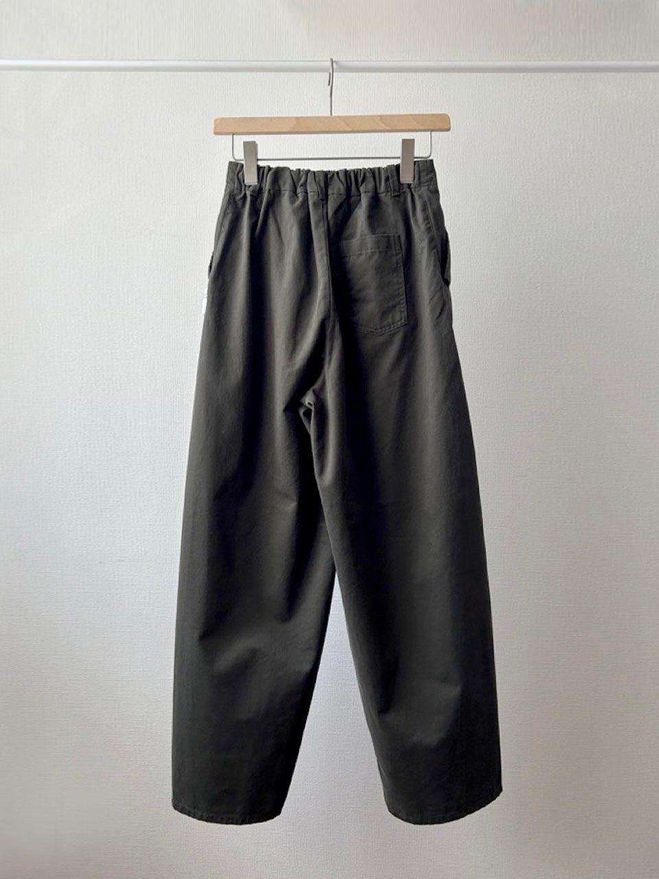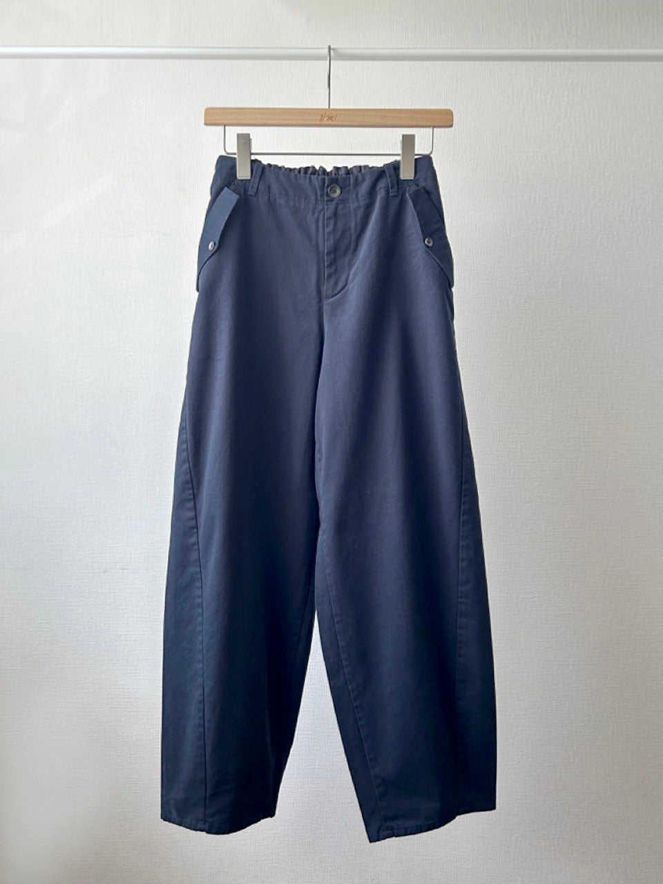 上品なシルエットに、あえてカジュアルな素材感とメタルボタンを合わせることで、ほどよく力の抜けたバランスになりました。きれいめにもラフにも着こなせる、万能な一本です。